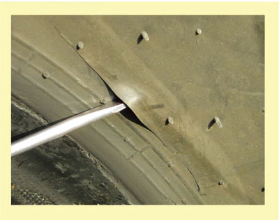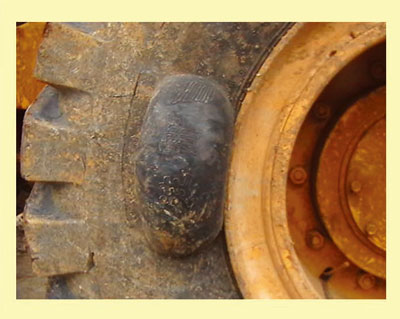 重皮、裂口特征:月臺(tái)肩部或側(cè)部膠與膠之間分層原因:制造原因:胎面壓出膠料混煉不均勻,半成品表硫化模具沽油污、滿離劑涂刷不均勻。屬質(zhì)量問題