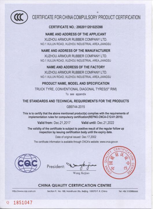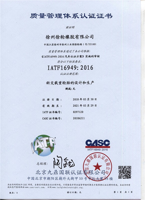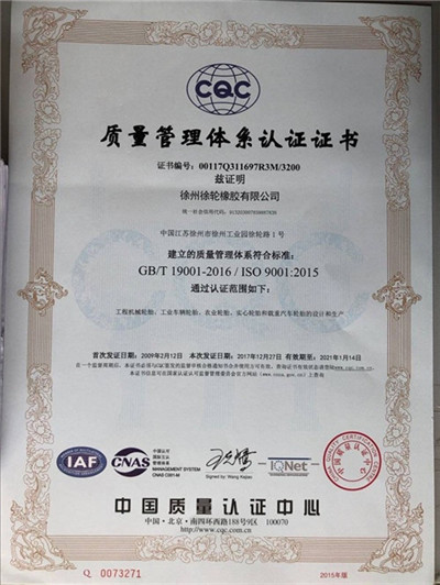 質(zhì)量是企業(yè)的生命,是企業(yè)得以生存和發(fā)展的基礎(chǔ)。公司自2006年創(chuàng)辦以來,徐輪橡膠就是一直對產(chǎn)品品質(zhì)孜孜以求,精益求精。以“質(zhì)量是生命 科技求領(lǐng)先 過程零缺陷 服務(wù)到永遠”為質(zhì)量方針,徐州徐輪橡膠有限公司建立健全了科學(xué)完善的質(zhì)量保證體系,自2009年起先后通過了ISO9001-2008、CCC、美國DOT、歐洲E-mark等質(zhì)量體系認證。
